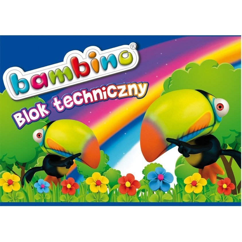 Blok techniczny BAMBINO__okładka kredowa, nabłyszczana o gramaturze 115 g/m2_wykorzystuje najnowsze motywy wzornicze BAMBINO__biały _ gramatura papieru _ 200 g/m2__kolorowy _ gramatura papieru _ 160 g/m2__całość usztywniona tekturowym podkładem__jednostka sprzedaży 1 sztuka