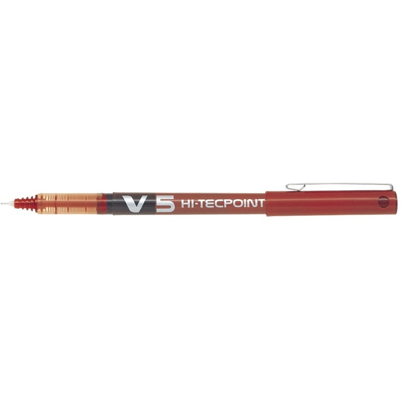 Cienkopis kulkowy z obudową w kolorze tuszu i okienkiem pozwalającym na kontrolę jego zużycia. Posiada bezpieczną wentylową skuwkę z metalowym klipem. Możliwość pisania po każdym rodzaju papieru. Polecane dla osób leworęcznych. Cienkopis V5 posiada igłową końcówkę, dzięki której linia pisania jest bardzo precyzyjna. Grubości linii pisania: 0,30 mm, długości linii pisania: 1700 m. Występuje w kolorach czarny, czerwony, niebieski, zielony._V5 produkowany jest w oparciu o technologię V-System, która obejmuje trzy filary technologiczne:_INK WRITING - Kiedy podczas pisania, ze zbiornika wydostaje się nadmiar atramentu, jest on przechowywany w specjalnie skonstruowanej końcówce z wbudowanymi mikro skrzydełkami. Dzięki temu ilość atramentu przepływającego do końcówki jest zawsze stała. Grubość pisanej linii nie zmienia się, pisze do ostatniej kropli._Hi-Tecpoint _ to niepowtarzalna końcówka wykonana ze stali nierdzewnej z zastosowaniem 3 symetrycznych wgłębień do podtrzymywania i wspierania kulki. Dzięki zastosowaniu Hi-Tecpoint, kulka podczas pisania obraca się bardzo lekko i płynnie._ATT System _ czyli system _skuwka w skuwce_. Wewnątrz zewnętrznej skuwki umieszczona jest mniejsza, która szczelnie zabezpiecza końcówkę piszącą. Dodatkowo w razie połknięcia umożliwia oddychanie._