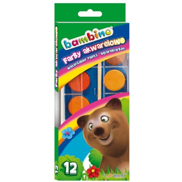 Farby akwarelowe_BAMBINO__farby wodne podane w postaci suchych,_dużych pastylek__12 intensywnych kolorów__dedykowane dzieciom i młodzieży, które chcą_tworzyć bardziej zaawansowane plastycznie prace,_głównie pejzaże czy portrety__pozwalają uzyskiwać efekty świetlistości,_delikatności, rozmycia konturów, grę światła__jednostka sprzedaży 1 opakowanie