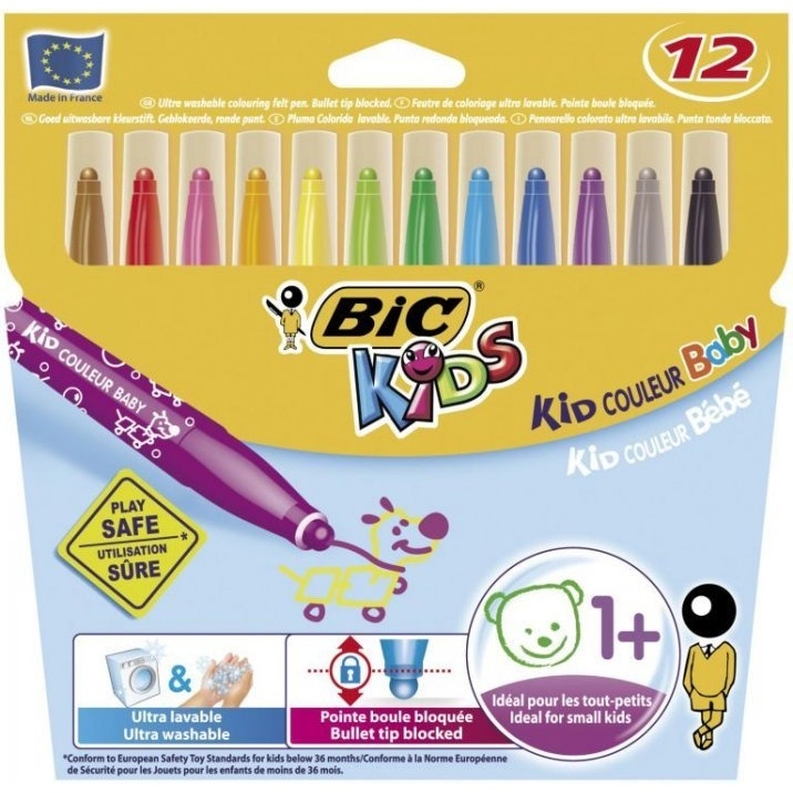 Flamastry Kid_Couleur Baby__flamastry przeznaczone dla_najmłodszych dzieci, Już od_pierwszego roku życia__okrągła, blokowana końcówka, brak_możliwości wciśnięcia do środka__szeroka gama kolorów__zmywalny tusz na bazie wody__łatwo spieralny z tkanin__łatwo zmywalny z rąk, ciała__mękka, wentylowana skuwka__nietoksyczne__produkt bezpieczny dla dzieci__jednostka sprzedaży 1 opakowanie