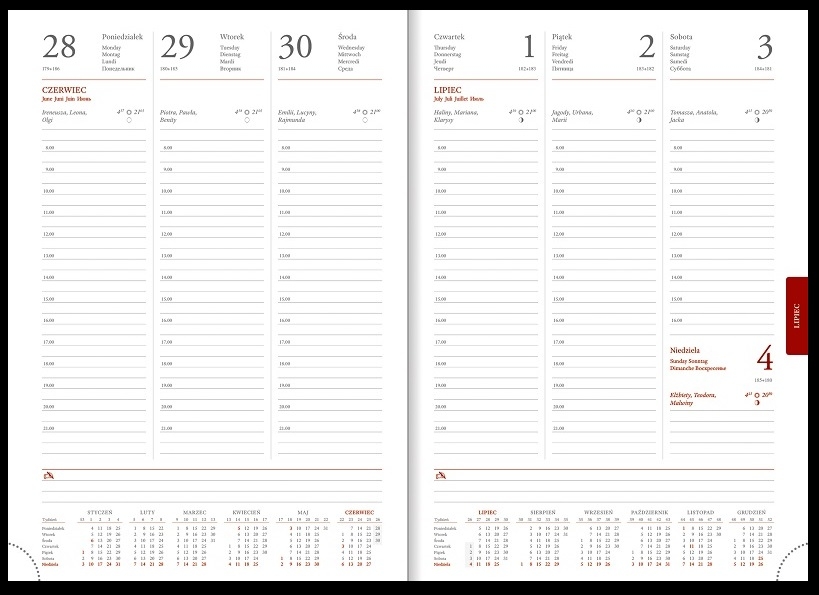 Miękka, przyjemna w dotyku oprawa wykonana z termoprzebarwialnego materiału pokryciowego Vivella w czternastu kolorach. Brzeg okładki obramowany ozdobnym przeszyciem. Rozmieszczenie daty wytłoczonej w górnej części okładki umożliwia wykonanie tłoczenia termicznego nawet na dużej powierzchni. Drukowany na białym papierze; bloki terminarza szyte nićmi; kapitałka i tasiemka białe; przejrzysty układ graficzny kalendarium; rozbudowana część informacyjna oraz barwne mapy przedstawiające kraje europejskie; oprawa umożliwia wykonanie nadruków, tłoczenia i personalizacji kalendarza.