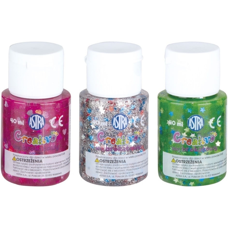 Klej brokatowy z dodatkiem confetti o pojemności 40 ml. Przeznaczony jest do zdobienia rysunków, malowideł oraz ozdobnego pisania. Można nim również dekorować przedmioty wykonane z gliny, masy solnej itp.