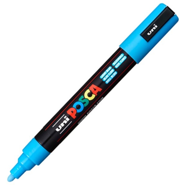 Uniwersalny marker UNI PC-5M z farbą plakatową do pisania i malowania po każdej powierzchni: papierze, tkaninie, plastiku, terakocie, szkle, porcelanie, metalu, drewnie _ odporny na działanie światła i warunków atmosferycznych _ tusz na bazie wody nie przesiąka przez papier _ różne kolory tuszu po wyschnięciu nie łączą się ze sobą _ okrągła końcówka - grubość linii pisania: 1,8 _ 2,5 mm