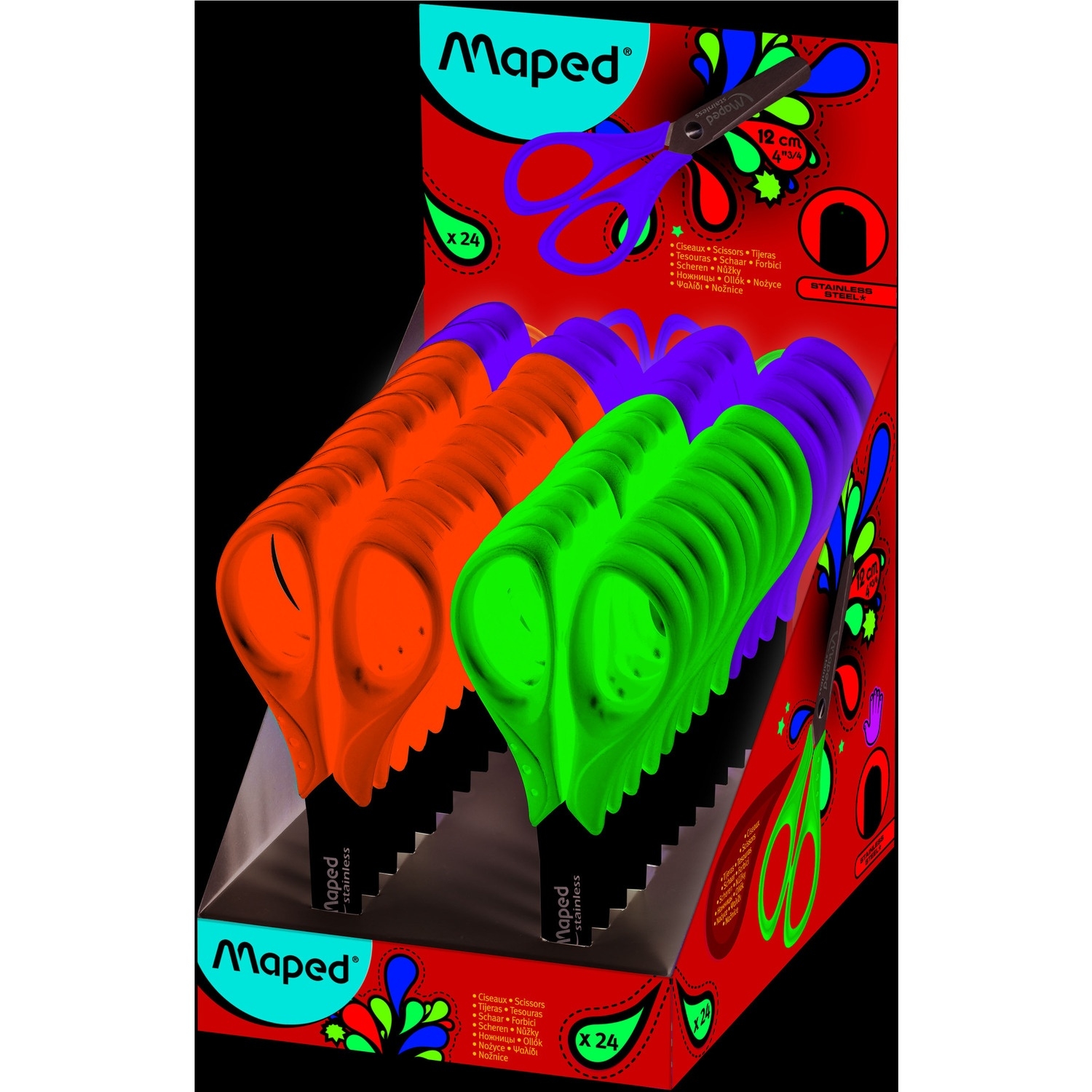 Nożyczki szkolne wykonane ze stali nierdzewnej dla prawo i leworęcznych. Grawerowane ostrza z zaokrąglonymi końcami - średnicy 10 mm. Plastikowe uchwyty profilem dostosowane do dziecięcej dłoni. Długość 13 cm. Miks 3 kolorów; niebieskie, zielone i różowe. JS 24 szt.