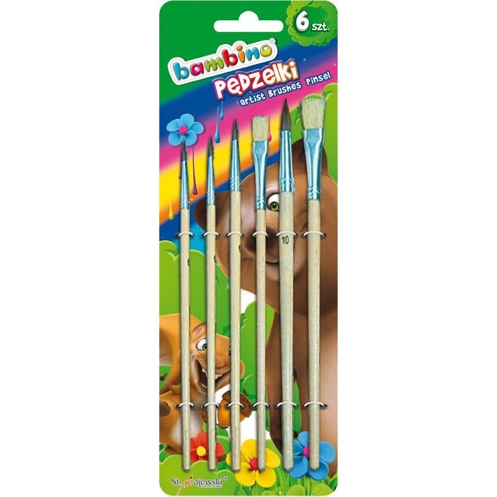 Praktyczny i uniwersalny zestaw 6 pędzelków szkolnych w rozmiarach: 2, 4, 6, 8, 10 i 12. Pędzelki idealnie rozprowadzają zarówno farby akwarelowe jak i plakatowe, ale można je też stosować do aplikacji kleju.