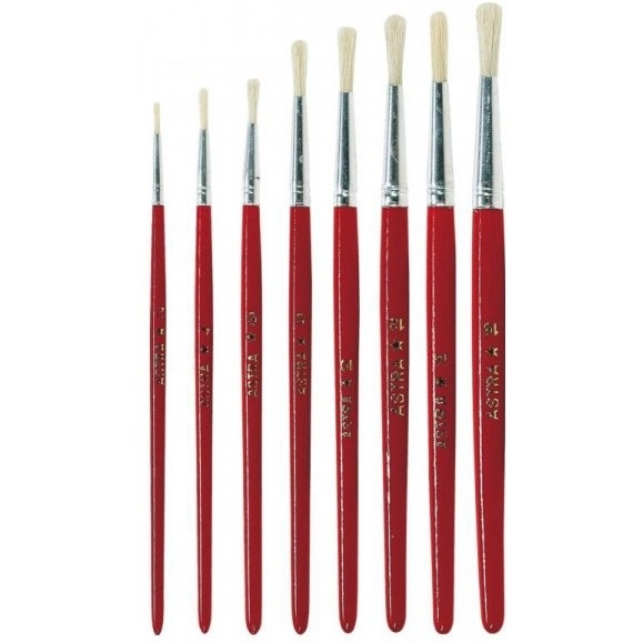 Wysokiej jakości pędzle szkolne ASTRY wykonane są z doskonałego drewna i naturalnego włosia, dzięki temu są trwałe i estetyczne. Paleta pędzli obejmuje 12 rozmiarów. W ofercie dostępne są pędzle okrągłe i płaskie.