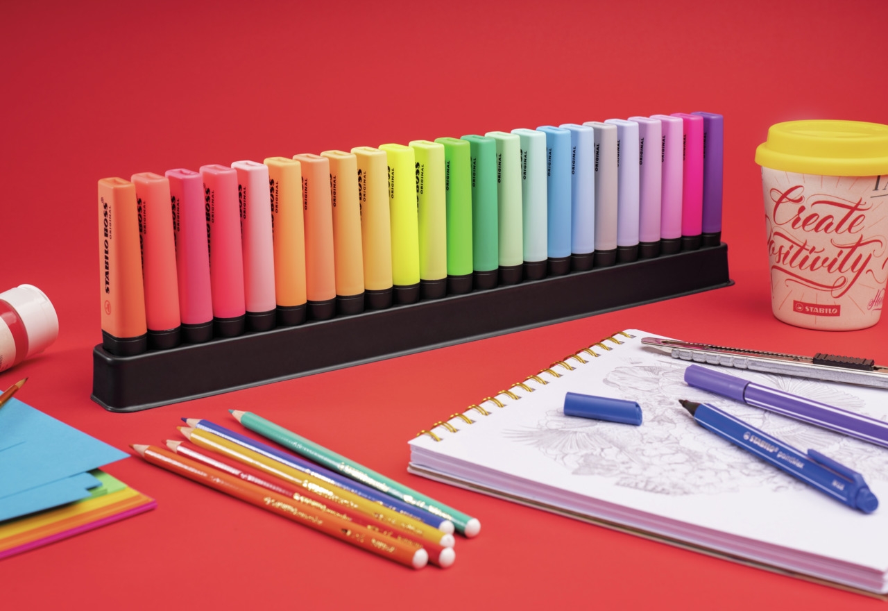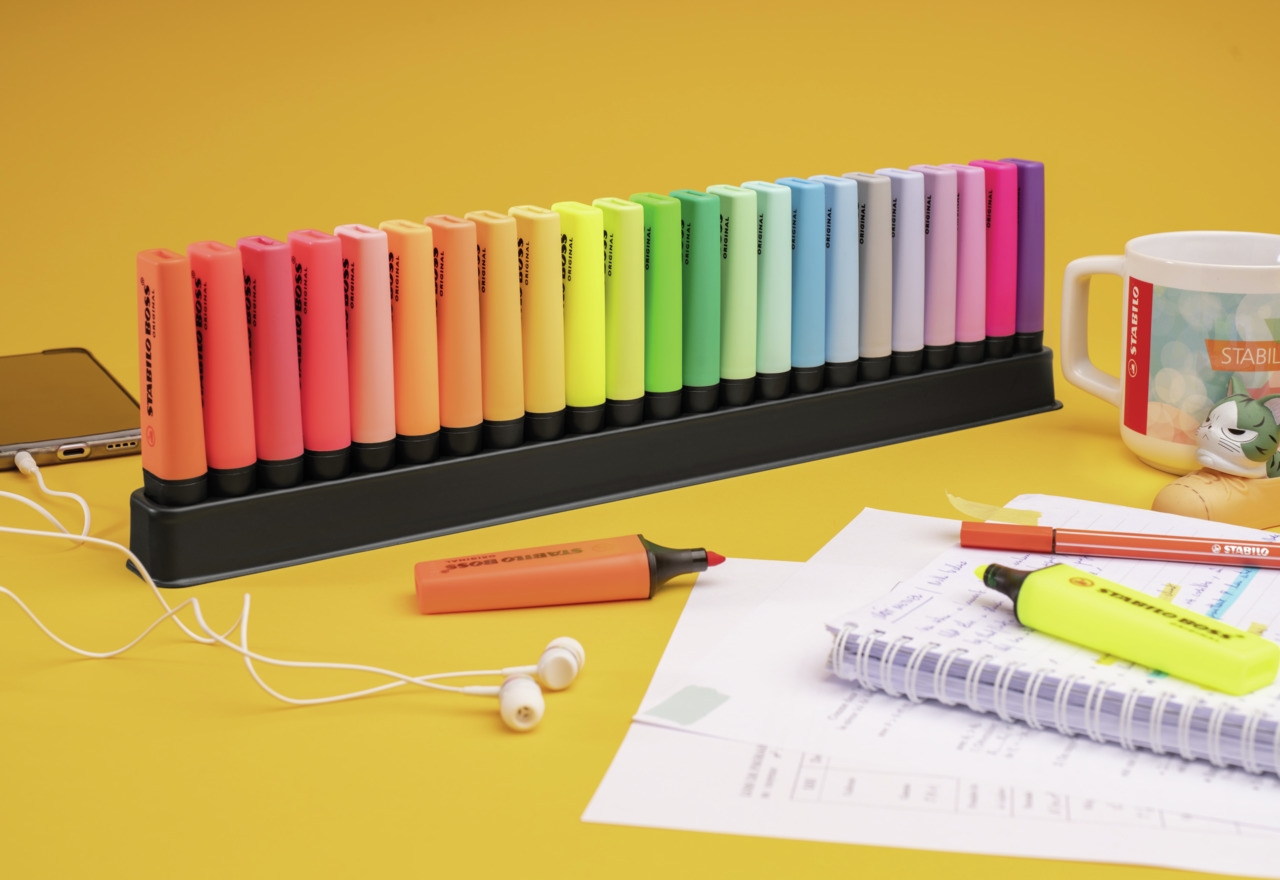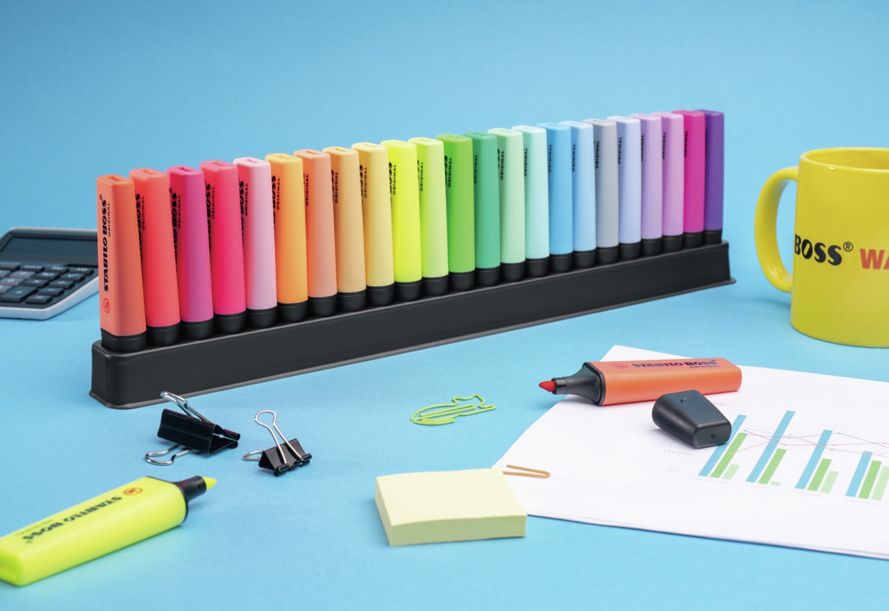 | STABILO BOSS ORIGINAL - prawdziwy klasyk wśród zakreślaczy i niedościgniony wzór! Dostępny jest w 9 kolorach neonowych a także w 14 kolorach pastelowych. Razem aż 23 możliwości do wyboru. Grubość linii od 2 do 5 mm pozwala na zakreślanie tekstów o różnej wielkości. Nadaje się też do pisania, ozdabiania, hand letteringu. Technologia Anti-dry zabezpiecza tusz przed zasychaniem, dzięki czemu można go używać nawet przez 4 godziny i mieć pewność, że nie zaschnie. W trosce o środowisko wszystkie czarne elementy zakreślacza wykonane są z plastiku pochodzącego z recyklingu. Opakowanie to plastikowe etui zawierające 23 szt. zakreślaczy (9 w kolorach neonowych i 14 w kolorach pastelowych). Zakreślacze w etui ustawione są na praktycznej szynie, która może też być podstawką na biurko. |