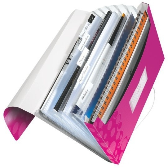Teczka z 6 przegródkami Leitz WOW__6 poszerzanych przegrodek z indeksami do opisu_dla łatwej identyfikacji zawartości__przednia przegródka służy do przechowywania rożnych_przedmiotow lub notatnika__mieści 250 kartek A4__jednostka sprzedaży 1 sztuka