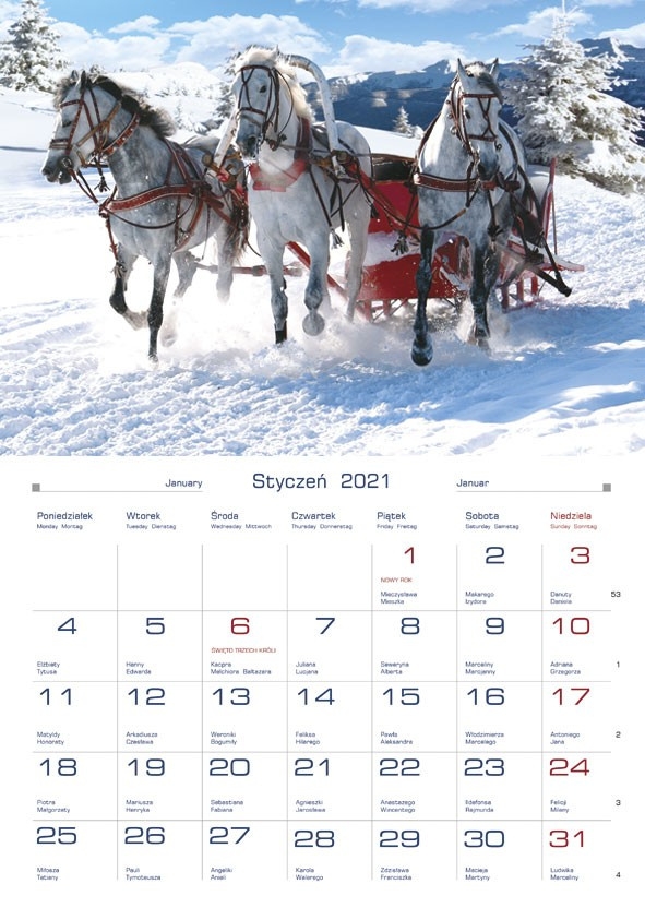 układ kalendarium: 1 miesiąc - 1 rozkładówka
