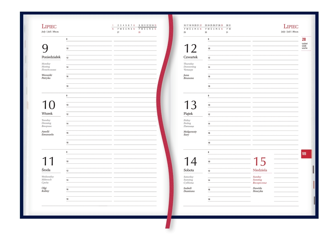 układ kalendarium: 1 tydzień - 2 strony + wkładka teleadresowa