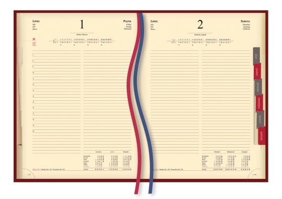 układ kalendarium: 1 dzień - 1 strona + strona na notatki po zakończeniu tygodnia. Sobota i niedziela na oddzielnych stronach.