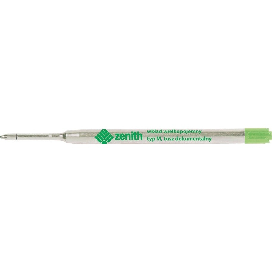 Wkład Zenith - 4 (20)_Metalowy wkład wielkopojemny, dostępny w trzech kolorach tuszu: niebieskim, czarnym, czerwonym. Jest to tusz dokumentalny, odporny na działanie światła i wody. Średnica kulki wkładu wynosi: 0,8 mm, szerokość linii pisania: 0,5 _ 0,7 mm, długość linii pisania: 3_500 m. Końcówka wkładu wykonana jest z mosiądzu wysokoniklowego, tzw. nowe srebro, i wyposażona w kulkę z węglika wolframu TC, co podnosi żywotność końcówki, dając równomierność parametrów pisania w trakcie całego okresu eksploatacji. Jednostka sprzedazy 1 opakowanie
