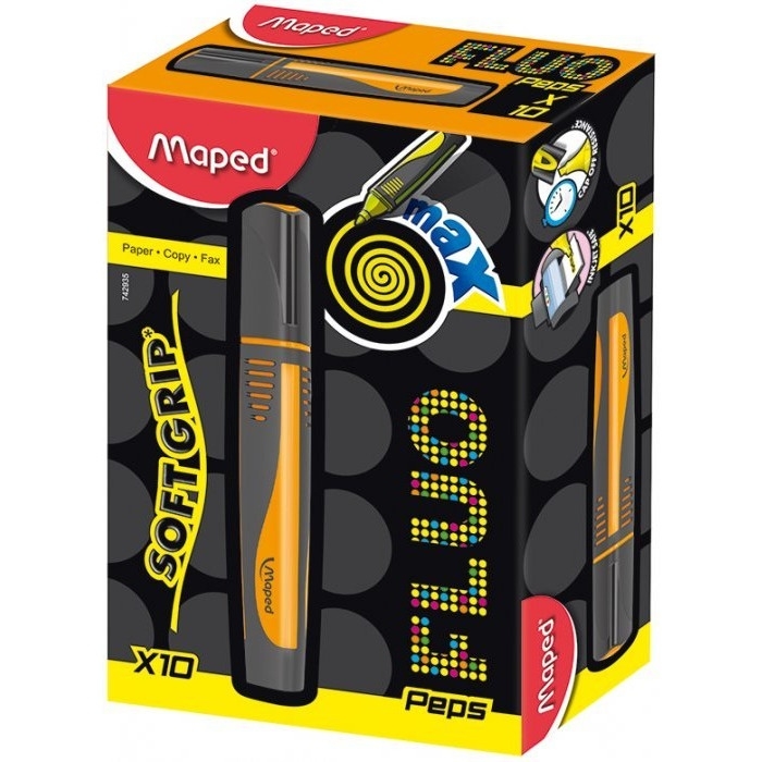 Zakreślacz FLUO PEPS MAX: podłużny kształt obudowy.Trójkątny uchwyt. Perforowane, miękkie boki zapewniają komfort kreślenia i zapobiegają wyślizgiwaniu się zakreślacza z dłoni.Tusz odporny na działanie swiatła - nietoksyczny o wysokiej wydajności i trwałości.Do wszystkich papierów standardowych, samokopiujacych, fotokopii, termopapierów i papierów faksowych. Pozostawione bez skuwki nawet po 4 godzinach nie tracą swoich właściwości. Ścięta końcówka umożliwia pisanie cienką i grubą linią od 1 do 5 mm. Kolor pomarańczowy. JS 10 szt.