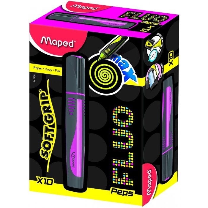 Zakreślacz FLUO PEPS MAX: podłużny kształt obudowy.Trójkątny uchwyt. Perforowane, miękkie boki zapewniają komfort kreślenia i zapobiegają wyślizgiwaniu się zakreślacza z dłoni.Tusz odporny na działanie swiatła - nietoksyczny o wysokiej wydajności i trwałości.Do wszystkich papierów standardowych, samokopiujacych, fotokopii, termopapierów i papierów faksowych. Pozostawione bez skuwki nawet po 4 godzinach nie tracą swoich właściwości. Ścięta końcówka umożliwia pisanie cienką i grubą linią od 1 do 5 mm. Kolor różowy. JS 10 szt.