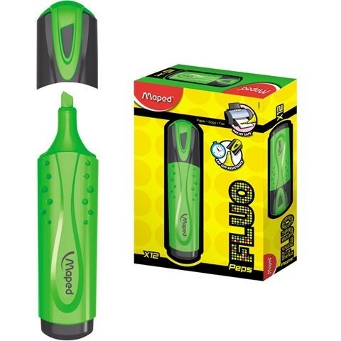 Zakreślacz FLUO PEPS: Klasyczny kształt obudowy. Perforowane boki zapewniają komfort kreślenia i zapobiegają wyslizgiwaniu się zakreślacza z dłoni.Tusz odporny na działanie swiatła - nietoksyczny o wysokiej wydajności i trwałości.Do wszystkich papierów standardowych, samokopiujacych, fotokopii, termopapierów i papierów faksowych. Pozostawione bez skuwki nawet po 4 godzinach nie tracą swoich właściwości. Ścięta końcówka umożliwia pisanie cienką i grubą linią od 1 do 5 mm. Kolor zielony. JS 12 szt.